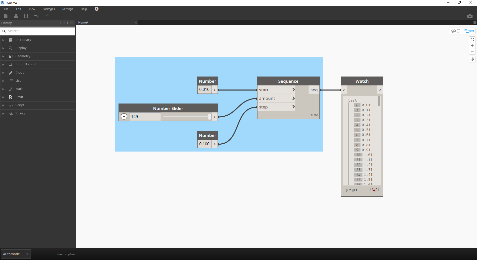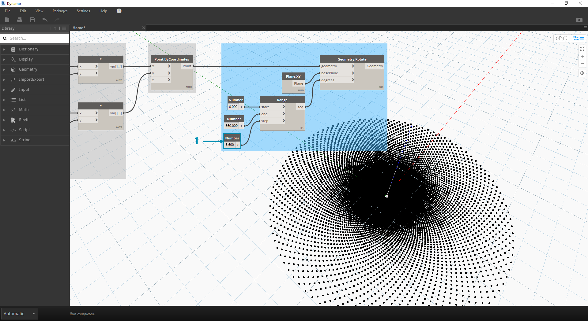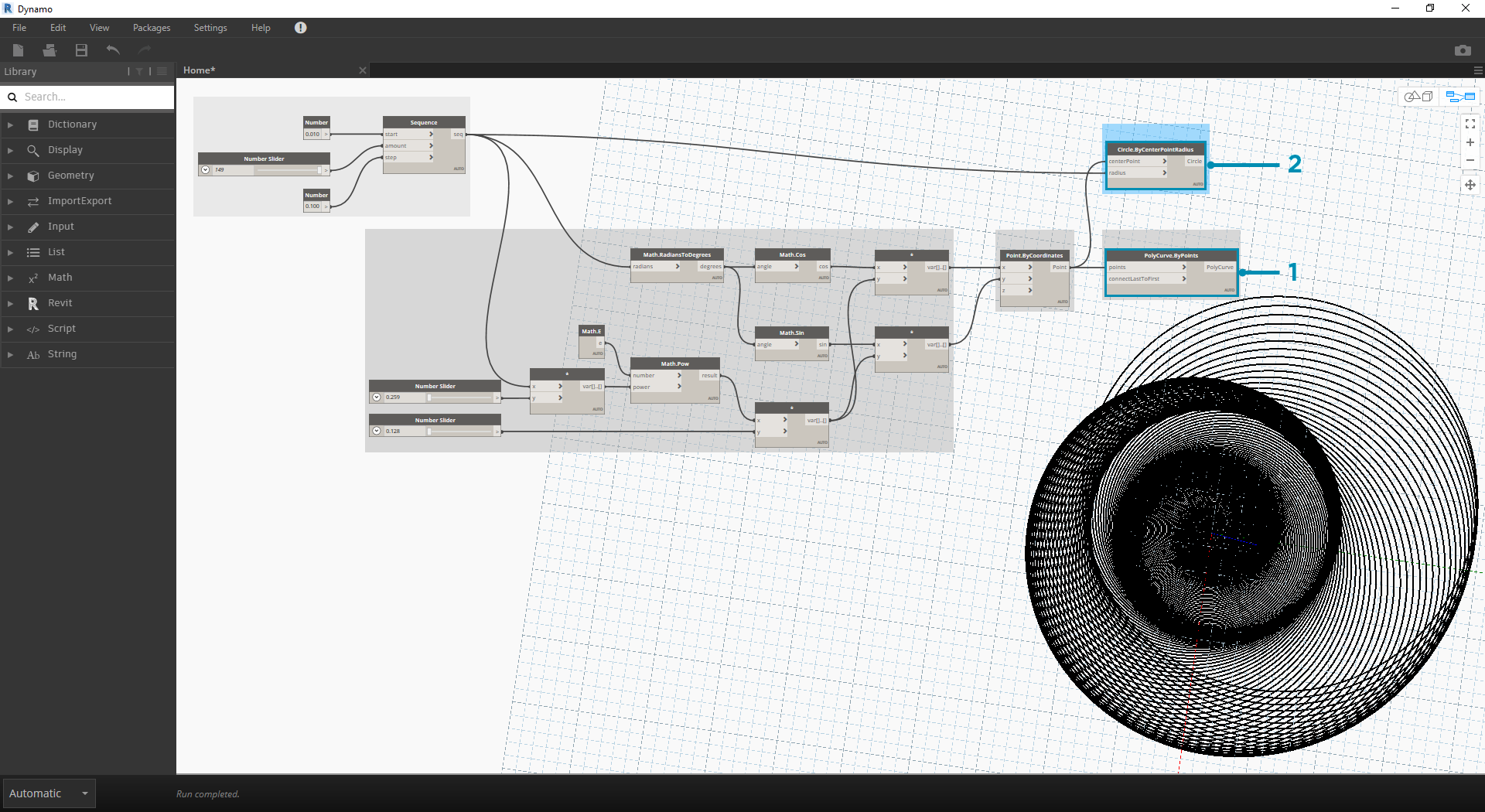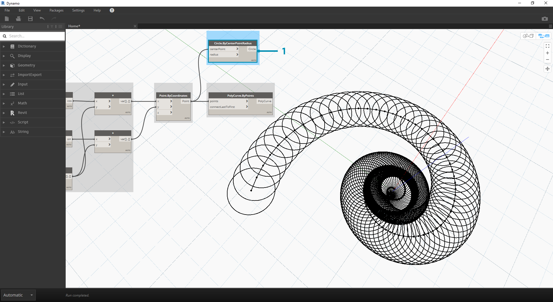 Now, the bulk of Nodes from the previous step will work fine, but it is a lot of work. To create a more efficient workflow, have a look at Code Blocks (section 3.3.2.3) to define a string of Dynamo expressions into one node. In this next series of steps, we'll look at using the parametric equation to draw the Fibonacci spiral.