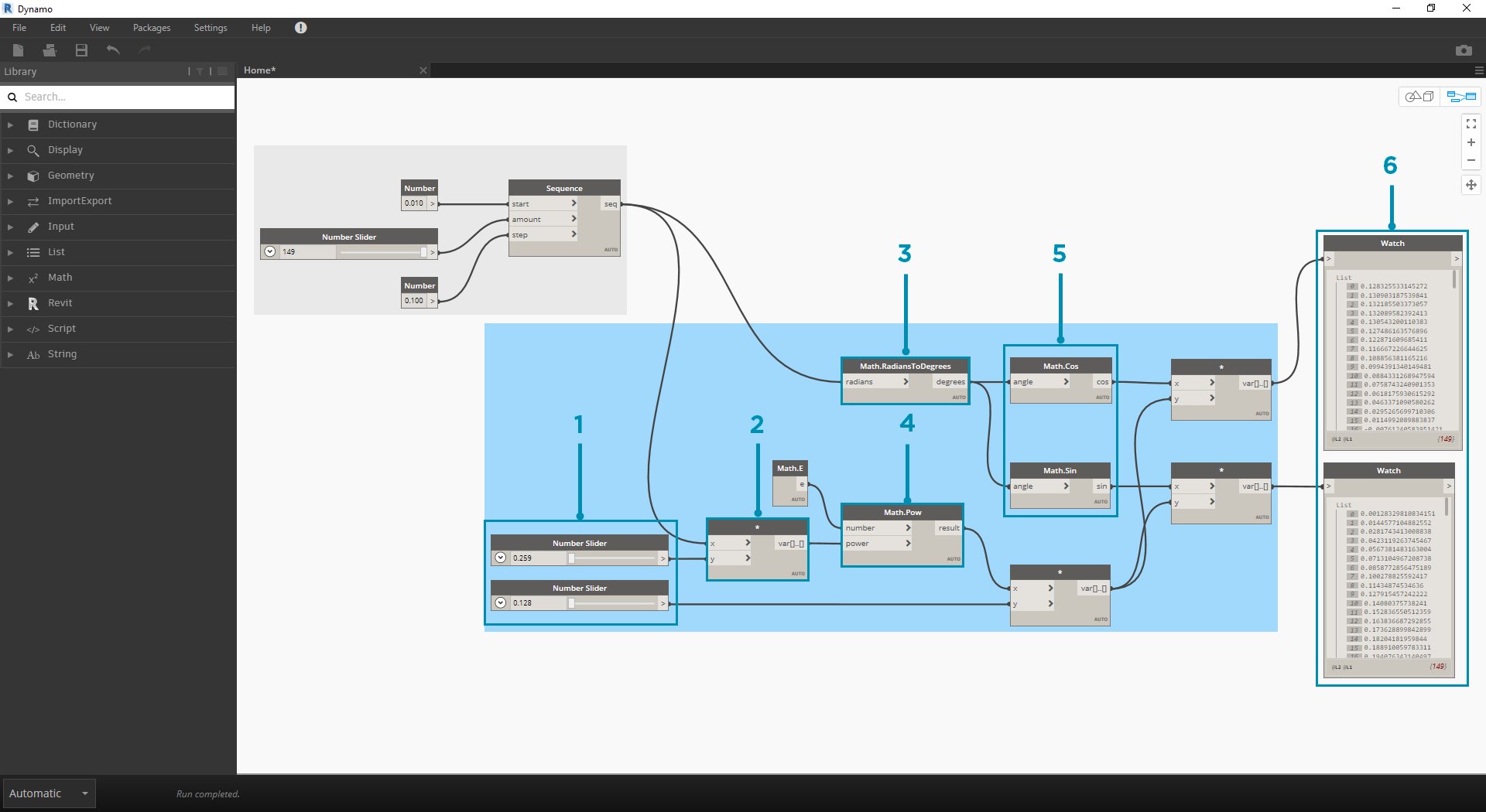 - Math.RadiansToDegrees: The 't' values need to be translated to degrees for their evaluation in the trigonometric functions. Remember, Dynamo defaults to degrees for evaluating these functions.