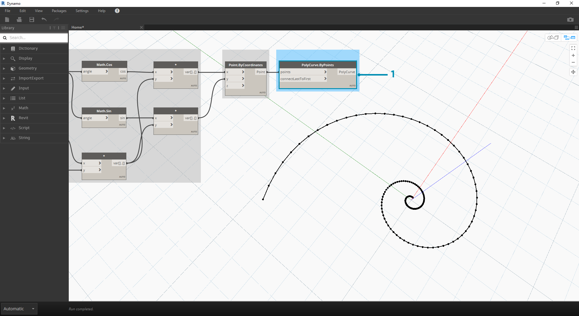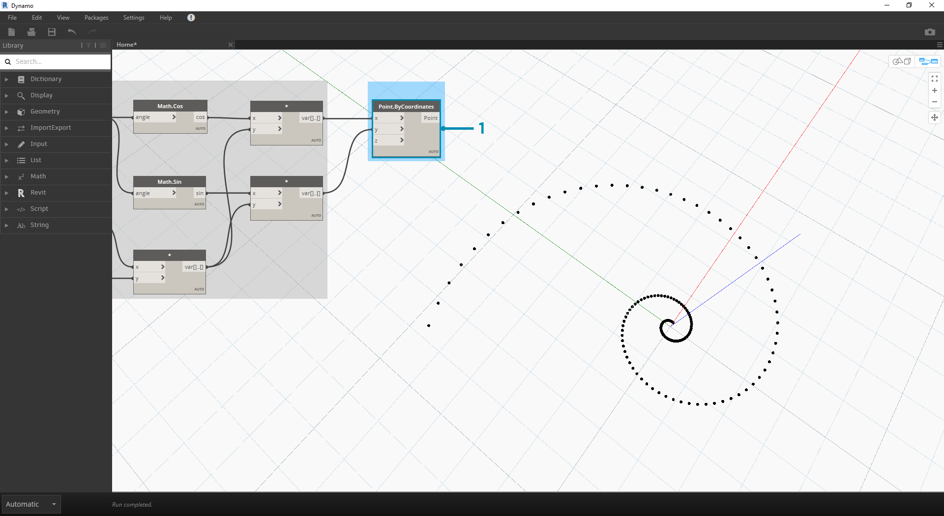 - Point.ByCoordinates: Connect the upper multiplication node into the 'x' input and the lower into the 'y' input. We now see a parametric spiral of points on the screen.