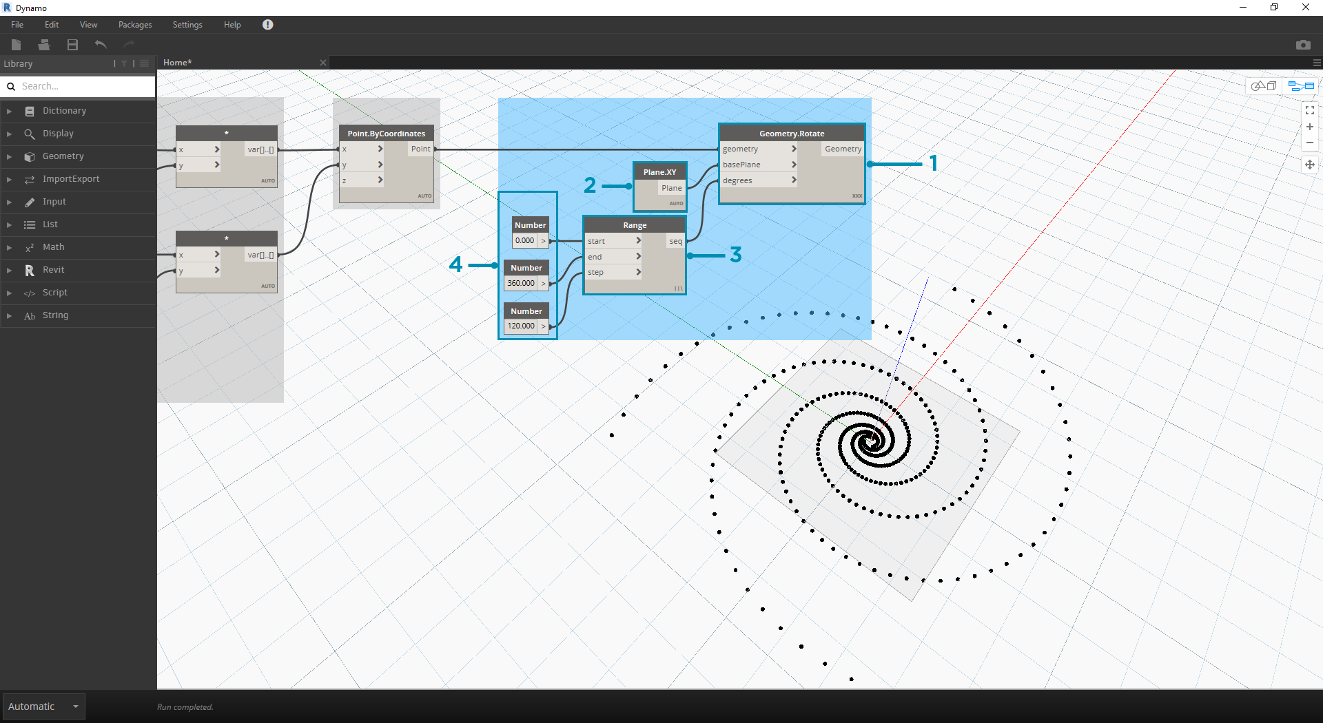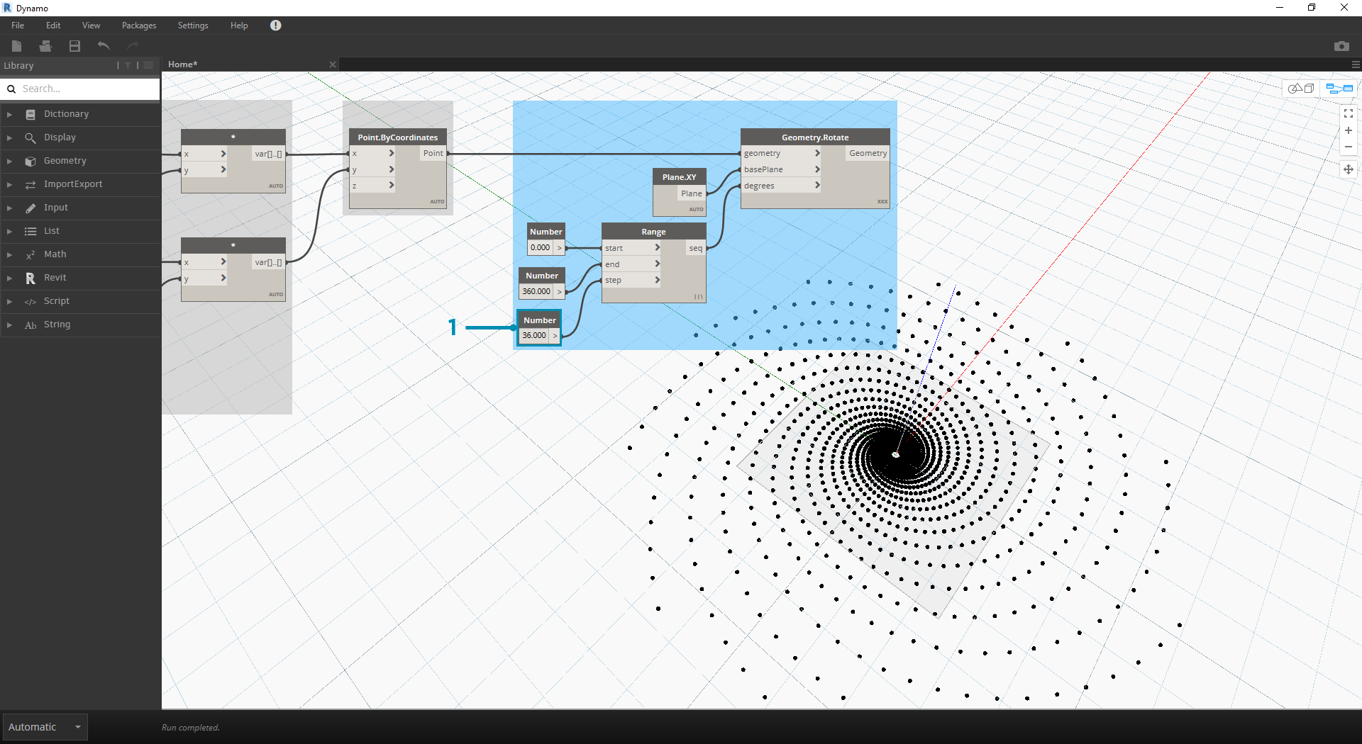 - As a jumping-off point, let's start with the same step from the previous exercise: creating a spiral array of points with the Point.ByCoordinates Node.