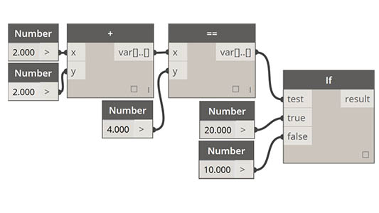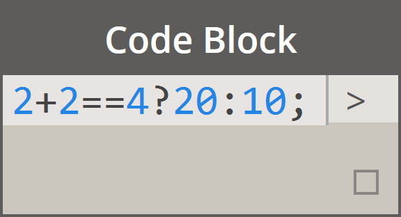 Any operator (+, &&, >=, Not, etc.) +, &&, >=, !, etc. Note that “Not” becomes “!” but the node is called “Not” to distinguish from “Factorial”