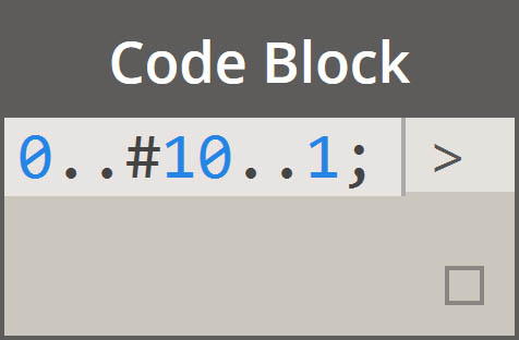 1. In this example, a number range is replaced by basic code block syntax defining the beginning..end..step-size;. Represented numerically, we get: 0..10..1;