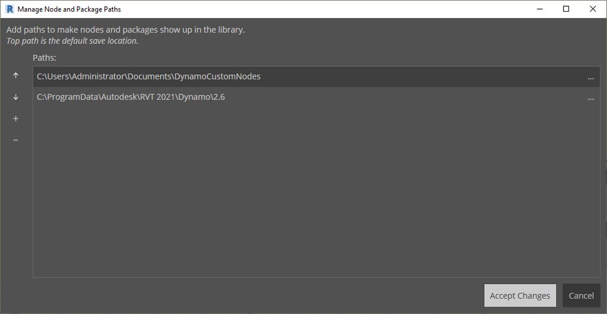 In this window we see two paths: AppData\Roaming\Dynamo... refers to the default location of Dynamo Packages installed online. Documents\DynamoCustomNodes... refers to the location of custom nodes we've published locally. *