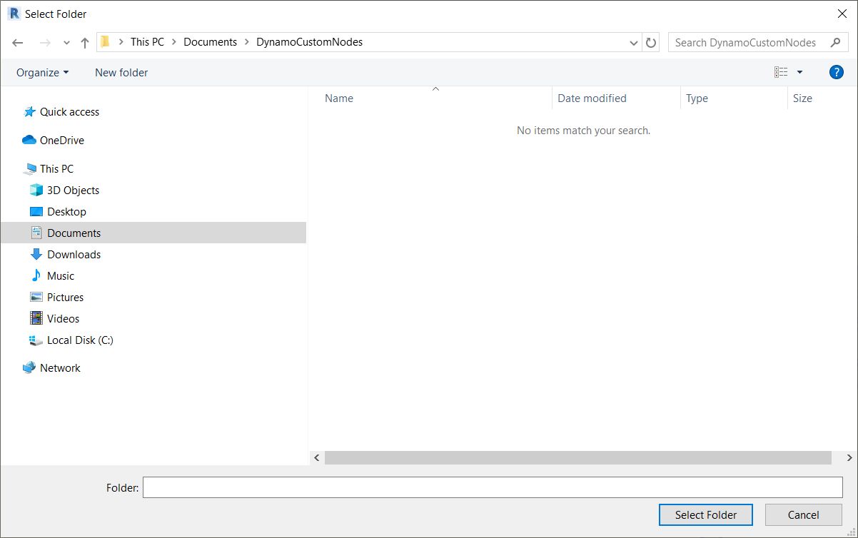 Choose a folder to house all of the custom nodes that you plan on publishing locally. Dynamo will check this folder each time it loads, so make sure the folder is in a permanent place. Navigate to this folder and choose "Select Folder". Your Dynamo node is now published locally, and will remain in your Dynamo Toolbar each time you load the program!
