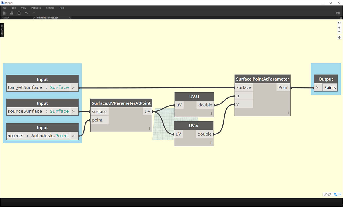 After opening the PointsToSurface custom node, we see the graph above in the Dynamo Custom Node Editor. You can also open up a custom node by double clicking on it in the Dynamo Graph Editor.