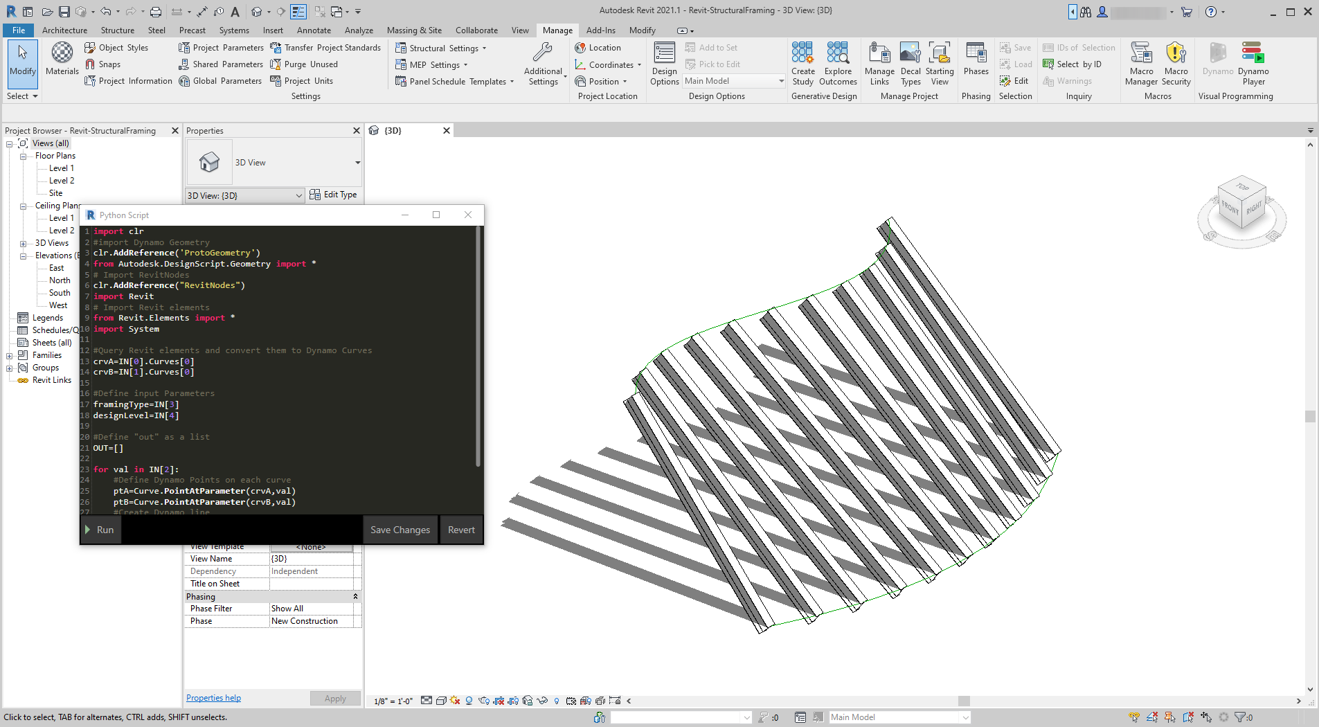 In Revit, we have an array of beams spanning the two curves as structural elements. Note: this isn't a realistic example...the structural elements are used as an example for native Revit instances created from Dynamo.