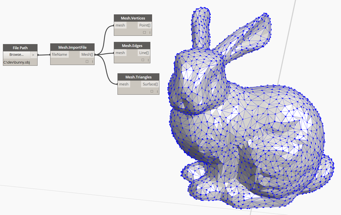 | The Dynamo Mesh Toolkit provides many useful tools for working with mesh geometry. The functionality of this package includes the ability to import meshes from external file formats, generate meshes from pre-existing Dynamo geometry objects, and manually build meshes through vertices and connectivity information. Additionally, this toolkit includes tools to modify and repair mesh geometry. |