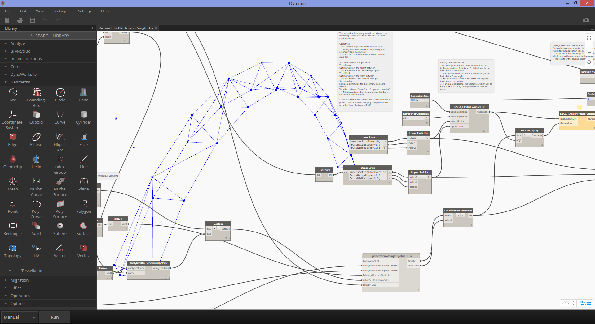 | Optimo provides dynamo users with the capability to optimize self-defined design problems by using various evolutionary algorithms. Users can define the problem objective or set of objectives as well as specific fitness functions. |