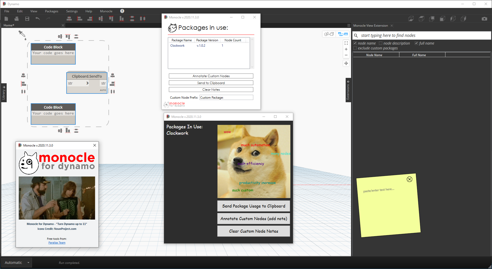| Monocle is a View Extension for Dynamo 2.0.x. Monocle contains a set of useful tools for package identification, graph cleanup and more! Monocle aims to add functionality to the Dynamo UI in a seemless way that leaves you thinking, "is this built into dynamo?". Monocle is available on the package manager. |